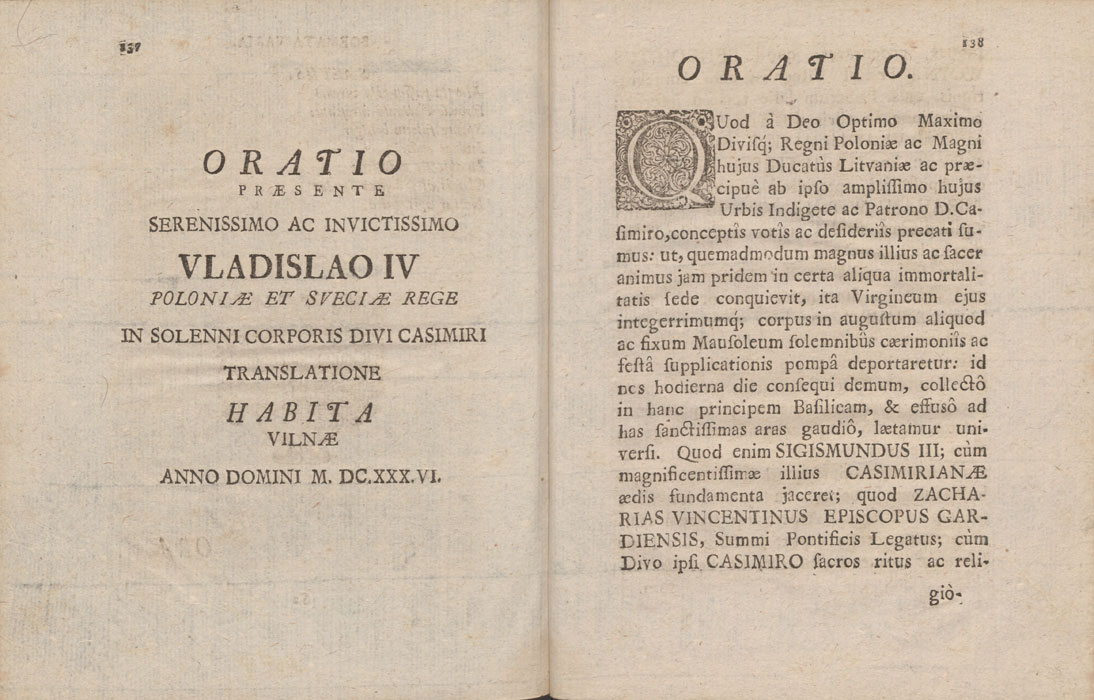Prie 1757-ais metais Vilniaus universiteto spaustuvėje išleistos Sarbievijaus poezijos rinktinės buvo pridėta ir kalba, pasakyta Vilniuje 1636 metais, perkeliant šventojo Kazimiero kūną į jam pastatytą koplyčią. Ceremonijoje dalyvavo ir karalius Vladislovas Vaza. Tuo metu Sarbievijus jau buvo paskirtas Vladislovo Vazos rūmų pamokslininku, turėjo kasdien sakyti pamokslus, visur lydėti karalių. Tas darbas labai slėgė ir vargino Sarbievijų, jis guodėsi laiškuose artimam bičiuliui vyskupui Stanislovui Lubienskiui. Sarbievijus 1640 metais atsistatydino iš šių pamokslininko pareigų, bet sveikata jau buvo palaužta: jis mirė sakydamas paskutinį pamokslą.