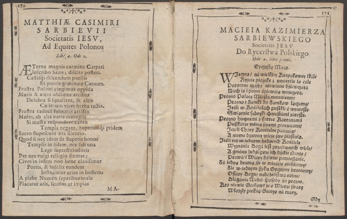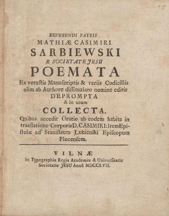 Adomo Naruševičiaus (1733–1796) parengtas Sarbievijaus kūrybos rinkinys, sudarytas iš įvairių šaltinių paimtais eiliuotais kūriniais, pamokslu, kai kuriais vyskupui Stanislovui Lubienskiui rašytais laiškais.