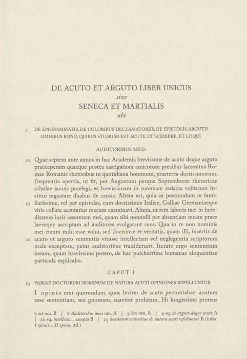 „Tai, ką šioje akademijoje prieš septynerius metus labai glaustai buvau išdėstęs apie aštrų ir šmaikštų stilių ir ką vėliau, gerokai pataisęs bei draugų prašymų pastūmėtas, išdėsčiau Romoje retorikos mokytojams, kai rugpjūčio ir rugsėjo mėnesį retorikos mokyklos durys kasdien buvo atviros gausiems klausytojams, be to, labai mokytiems žmonėms, – visa tai, kiek galima labiau sutrumpinęs, nutariau drauge su jumis dar kartą apsvarstyti dėl dviejų priežasčių. Pirmoji yra ta, kad po to, tiesiogiai arba laiškais sulyginęs savo mintis su Italijos, Prancūzijos ir Vokietijos mokslininkų nuomonėmis, dar rūpestingiau visa tai pergalvojau. Antroji priežastis ta, kad norėjau atgauti teises į savo paties kūrinį, kurį, man nesant, kai kurie, nerūpestingai ir netiksliai užsirašę, skelbė savo klausytojams. Šiuo atveju man rūpėjo ne tiek sava šlovė, kiek mokslas ir tiesa, kuriuos anie, dėl neaiškių minčių apie stiliaus aštrumą ir šmaikštumą klaidingai supratę, dar prasčiau perdavė savo klausytojams. Taigi aš kiek įmanydamas glausčiau dar sykį išdėstysiu savo nuomonę apie šią gražiausią žmonių iškalbos dalį.“