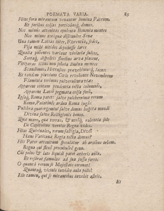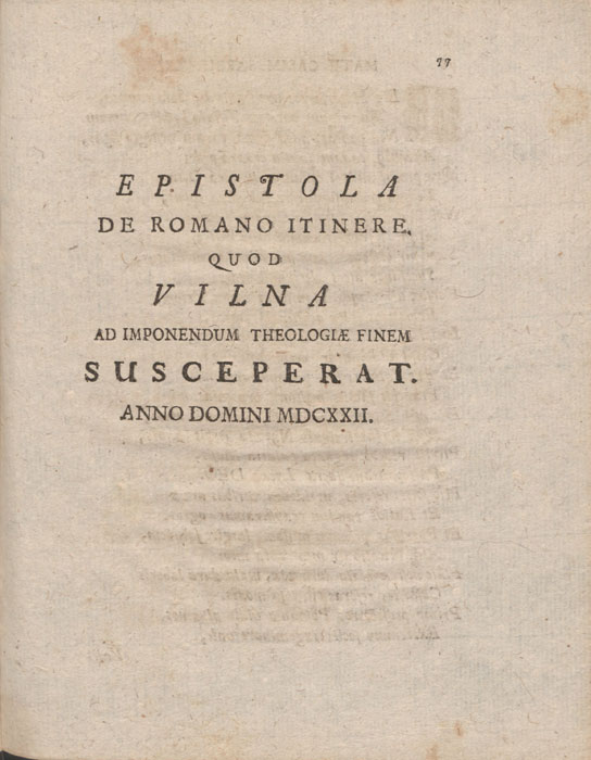 Antraštinis rinktinėje išspausdintos poemėlės „Laiškas apie kelionę į Romą, kurion leidosi iš Vilniaus, kad užbaigtų teologijos studijas. 1622-ais Viešpaties metais“ (Epistola de Romano itinere, quod Vilna ad imponendum theologiae finem susceperat. Anno Domini MDCXXII.) lapas. Pirmą kartą, praėjus šimtui trylikai metų po Sarbievijaus mirties, ji buvo paskelbta 1753 m. Drezdene išėjusiame leidinyje M. C. Sarbievii R. P. Societatis Iesu Poloni Elegia Itineraria ex manuscriptis edita. Poemėlė „Kelionė į Romą“ parašyta 1622-ų metų rudenį Romoje ir tarsi poetinis laiškas galėjo būti skirta Pultusko kolegijos jėzuitams ir ten buvusiam bičiuliui Mikalojui Kmicičiui (Nicolaus Kmicic, 1601–1632). Šis buvo Sarbievijaus mokinys Vilniaus universitete, vėliau dėstė poetiką, rašė eiles. Poemėlė Živilės Nedzinskaitės išversta į lietuvių kalbą ir publikuota.