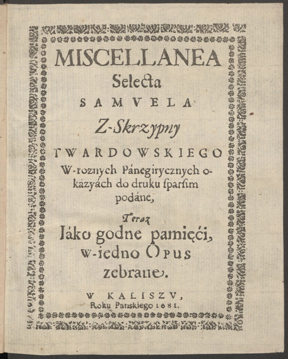 Vieno garsiausių XVII a. lenkų Baroko poetų, panegirikų autoriaus, satyriko, vertėjo ir istoriko Samuelio Liudviko Tvardovskio (Samuel Ludwik Twardowski, 1600–1661) kūrinių rinktinė, kurioje paskelbti ir Motiejaus Kazimiero Sarbievijaus kai kurių odžių vertimai į lenkų kalbą.