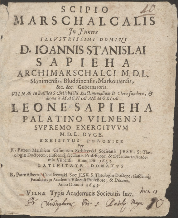 M. K. Sarbievijaus pamokslas Maršalo lazda (Scipio marschalcalis), išverstas į lotynų kalbą Alberto Cieciševskio ir išspausdintas Vilniaus akademijos spaustuvėje, praėjus penkeriems metams po Sarbievijaus mirties.