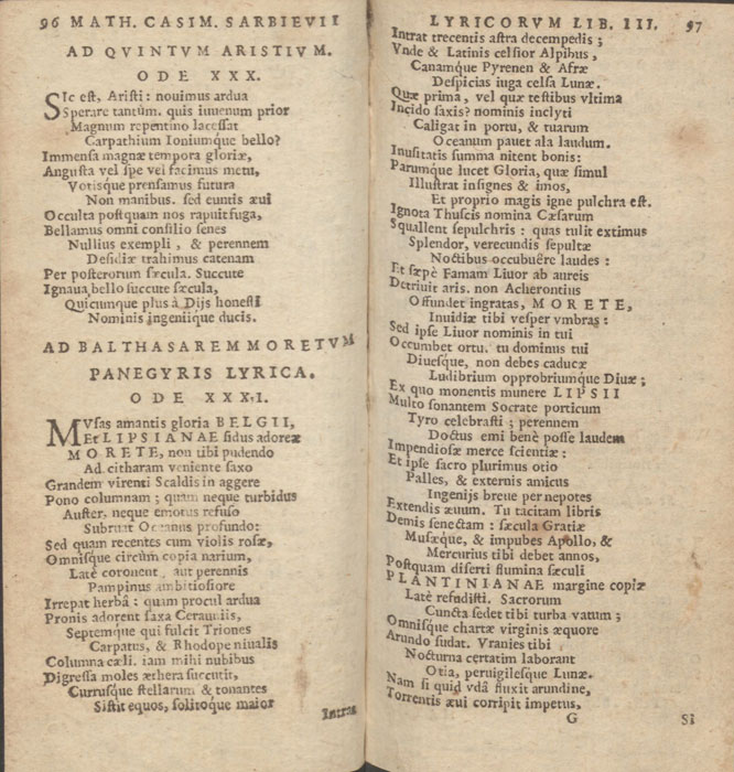 Eleonora Buožytė-Terleckienė pastebi, jog plačioji krikščioniškoji Europa, jos intelektualai Sarbievijaus kūrybą išgirdo ir įvertino, kai poeto rinktinė 1632 m. buvo išspausdinta Officina Plantiniana leidykloje. Tai buvo viena svarbiausių XVI–XVII a. Europos leidyklų. Jos savininkas, garsus humanistas Baltazaras Moretas (1574–1641) susidomėjo Sarbievijumi, įvertino poezijos kokybę. Mokyklos laikų draugo Peterio Paulio Rubenso (1577–1640) paprašė sukurti frontispiso eskizą. Dedikaciją popiežiui Urbonui VIII sukūrė ne Sarbievijus, o Antverpeno jėzuitai. Knyga turėjo pasisekimą: per porą metų buvo išparduota. Tada B. Moretas nusprendė sumažinti jos dydį, knyga tapo pigesnė, lengviau platinama. Rubensas naujai pritaikė antraštinį lapą – iš ankstesnio frontispiso paliko tik laurais vainikuotos lyros simbolį.
