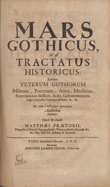 Mato Pretorijaus Mars Gothicus (Gotų Marsas arba gotų karyba) tarsi pratęsia 1688 m. išleistą Gotų pasaulį. Pirmojoje knygoje buvo aiškinamasi, kur gyveno gotai, kokios tautos ir valstybės sudarė gotų pasaulį, ką laikyti gotais sarmatais ir taip toliau. Antrojoje knygoje aptariama senovės gotų kariuomenė, karinė galia, ginkluotė, karinės mašinos, mokymai, kautynių rikiuotė, įstatymai, karių atlyginimai ir bausmės bei kiti dalykai.