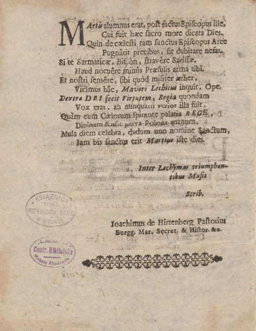 Deja, iš pirmosios dalies yra tik ilga dedikacija didikui, politikui, rašytojui Antanui Stanislovui Ščiukai (1654–1710). A. Tilkovskis jį giria kaip išmintingą ir narsų vyrą, leidžiasi į šio giminės istoriją.