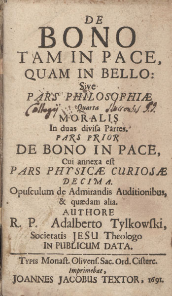 De bono tam in pace, quam in bello, sive Pars philosophiae quarta moralis, in duas divisa partes ... Ps 2 : De bono et malo, sive De prudentia et arte in bello ... Olivae [Gdańsk] : typis monast. Olivens. Sac. Ord. Cisters. imprimebat Joannes Jacobus Textor, 1691.