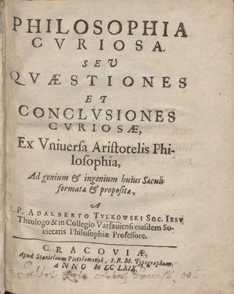 1669 m. Krokuvoje išėjo Įdomioji filosofija, arba klausimai ir įdėmios išvados, iš visos Aristotelio filosofijos pagal šio amžiaus prigimtį ir protą suformuotos bei išdėstytos garbiojo tėvo Adalberto Tilkovskio, Jėzaus Draugijos teologo ir tos pačios draugijos Varšuvos kolegijos filosofijos profesoriaus.