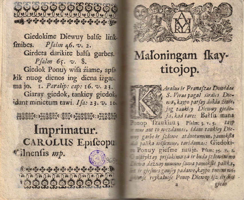 Vilniaus vyskupo Karolio Karpio (Carolus episcopus Vilnensis) duota aprobata ir autoriaus pasirašytos pratarmės maloningam skaitytojui pradžia.