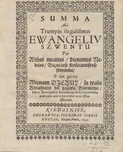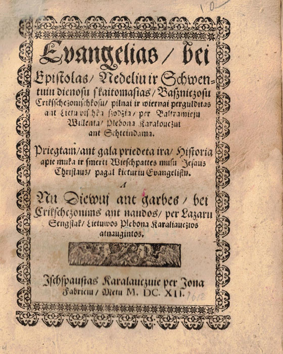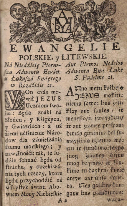 Pedagogas jėzuitas Jonas Jaknavičius (1589–1668) parengė ir 1637 m. Vilniuje išleido Lenkiškas ir lietuviškas evangelijas. Nors XVII–XIX a. išėjo daugiau nei 40 laidų, vis dėlto išliko palyginti nedaug šios knygos egzempliorių, ir tie patys su defektais. LMA Vrublevskių bibliotekoje saugomas 10-osios laidos egzempliorius, stokojantis antraštinio lapo.