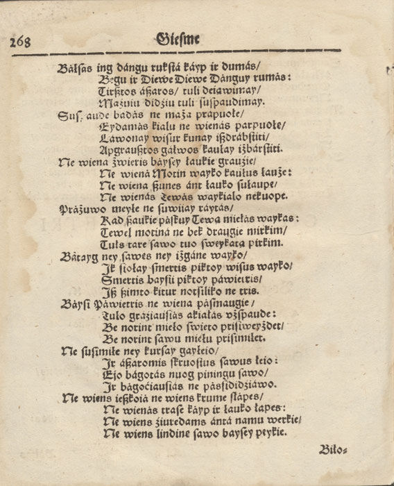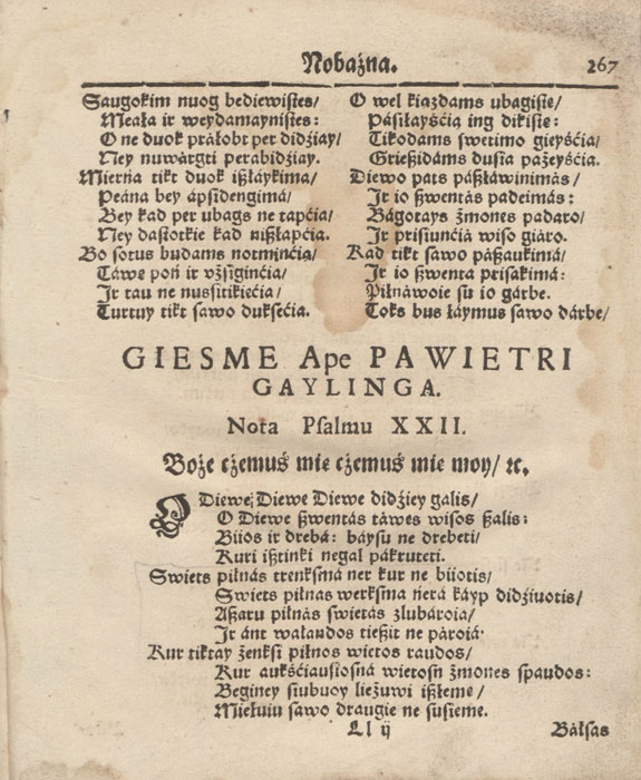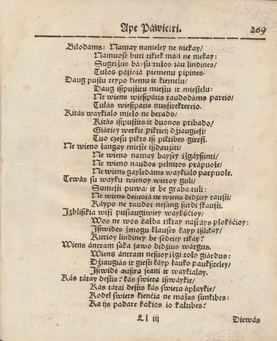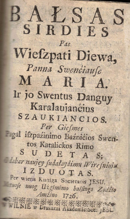 1648 metais įvairiomis kalbomis sukurtų sveikinimų rinkinyje Ver Lukiskanum (Lukiškių pavasaris), skirtame pagerbti į Vilnių atvykusią karališkają porą – Vladislovą IV Vazą (1595–1648) ir jo sutuoktinę Liudviką Mariją Gonzagą (1611–1667), eleginiu distichu prabylama ir lietuvių kalba:
