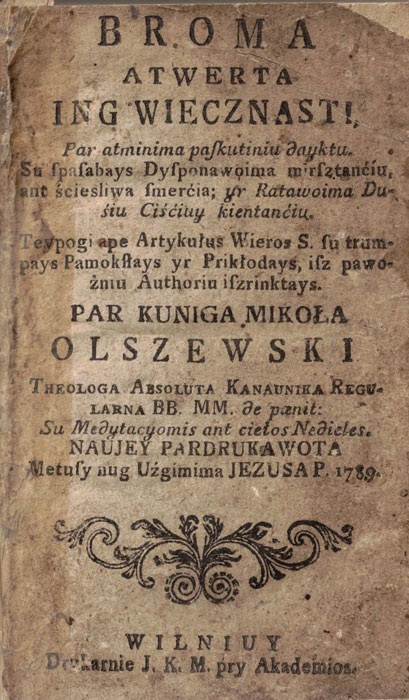 1753 metais Vilniuje, Pranciškonų spaustuvėje, išleista populiari religinės katalikiškos moralistikos knyga, kuri šiuolaikine lietuvių kalba skambėtų kaip „Amžinybėn atverti vartai“. Daugelio laidų sulaukusią knygą parašė iš Žemaitijos kilęs Regulinių kanauninkų ordino vienuolis, pamokslininkas Mykolas Olševskis (apie 1712 – apie 1779). Pirmoji šios tikėjimo aiškinimų su didaktiniais vaizdeliais knygos, kurioje, kaip yra pastebėjęs Mikas Vaicekauskas, „ryškiai atsiskleidžia barokinė pasaulėvoka bei mirties samprata“, laida išėjo su lotyniška autoriaus dedikacija Salantų dekanui Pranciškui Kovalevskiui. Iki 1851 metų ji su tam tikrais pakeitimais dar buvo išleista 17 kartų Vilniaus akademijos, Bazilijonų, taip pat Rommo ir Dworzeco spaustuvėse.