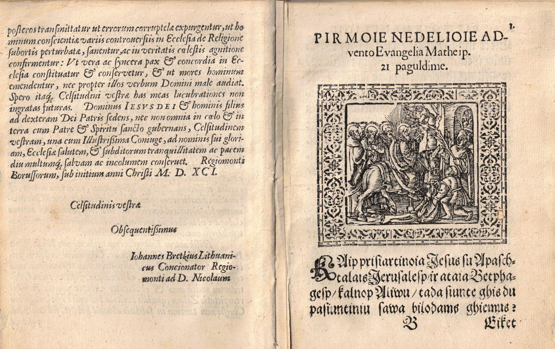 Dedikacijos pabaigoje pasirašo autorius: Celsitudinis vestrae Obsequentissimus Iohannes Bretkius Lithuanicus Concionator Regiomonti ad D. Nicolaum (Užvis labiau atsidavęs Jūsų Aukštenybei Jonas Bretkūnas, lietuvių pamokslininkas Karaliaučiuje, Šv. Mikalojaus bažnyčioje).