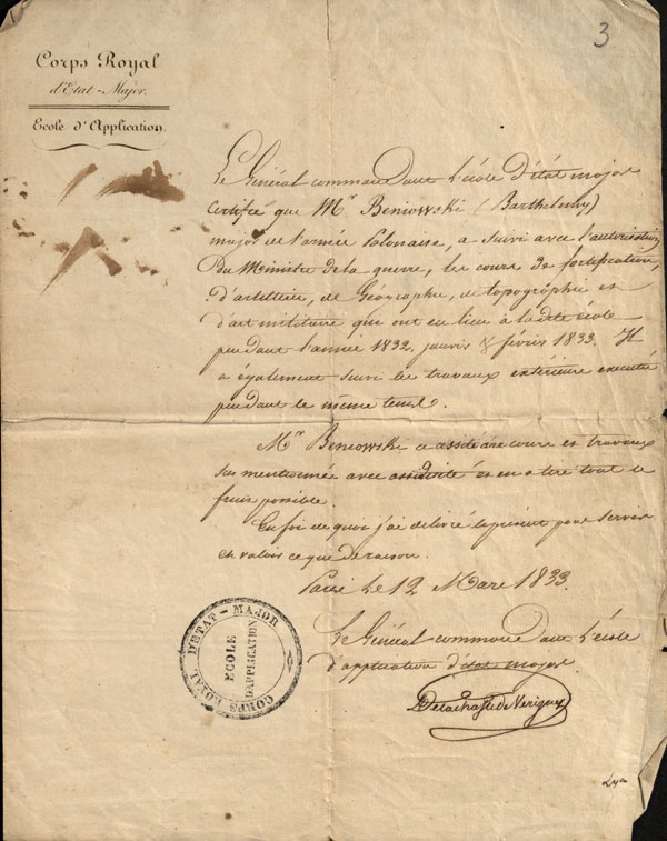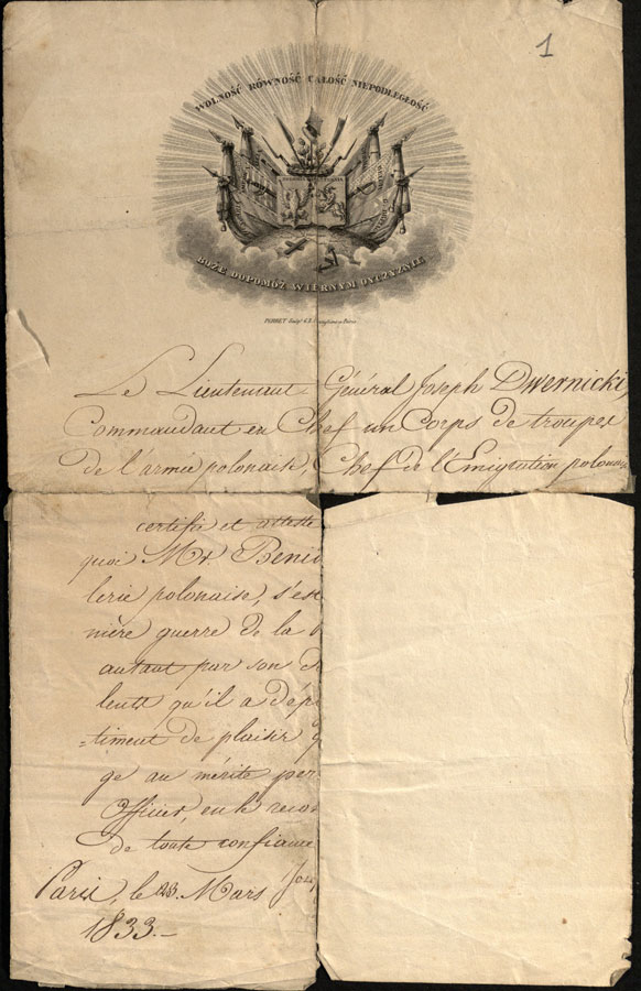 Neturėdamas pinigų ir negalėdamas grąžinti iždo suteiktos stipendijos, Bartłomiejus Beniowskis 1823 metais buvo paskirtas septynerius metus tarnauti kaip karo medikas Balstogės pėstininkų pulke. Pirmuosius dvejus metus, tikriausiai iki 1826 metų pradžios, jis mokėsi Sankt Peterburgo karo medicinos akademijoje, vėliau tarnavo Mogiliave, Kobryne. Pastarajame mieste 1829 ar 1830 metų pradžioje jis vedė Augustyną Aleksandrą Kryńską (g. 1809) ir su ja 1830 metų spalio 5 dieną susilaukė dukters Emilijos. Praėjus vos kelioms savaitėms po dukters gimimo, tų pačių metų gruodį, jo pulkas išvyko malšinti lapkričio 29 dieną Varšuvoje prasidėjusio sukilimo. Lemiama buvo 1831 metų balandžio 25 diena, maždaug antra valanda po pietų, kai jis Kuflevo kaime (Mazovijos vaivadija) kirto fronto liniją ir prisijungė prie Lenkijos kariuomenės. Nuo gegužės vidurio jis jau dirbo gydytojo padėjėju karo ligoninėje Varšuvoje. Sukilimui pralaimint, praėjus vos penkiems mėnesiams po perėjimo į lenkų pusę, suprasdamas, kad kaip dezertyro jo lauktų mirties bausmė, Beniowskis pasiprašė atleidžiamas iš kariuomenės. Ketindamas vykti į Paryžių, jis paprašė užsienio reikalų ministro Teodoro Morawskio (1797–1879) rekomendacinio laiško generolui Karoliui Otto′ui Kniaziewicziui (1762–1842) – Lenkijos vyriausybės atstovui Paryžiuje. Laiške rašoma, kad Beniowskis dėl kilusio pavojaus buvo priverstas atsistatydinti, ir prašoma jam padėti, nes to jis nusipelnė aukodamasis dėl tėvynės. Išlikusiame laiške aiškiai matomos daugybė lenkimo žymių. Galima spėti, kad dokumentas traukiantis iš Lenkijos per Prūsiją į Paryžių buvo sulankstytas į siaurą juostelę ir paslėptas – gal bate, gal tarp rūbų.